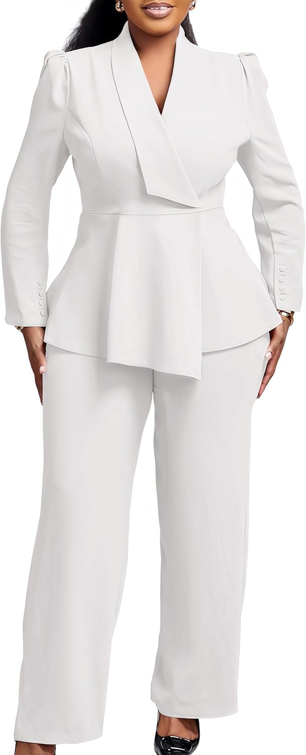 Women Suit Jacket 2 Piece Ruffle Blazer with Wide Leg Pants Suit Long Sleeve Business Casual Outfits