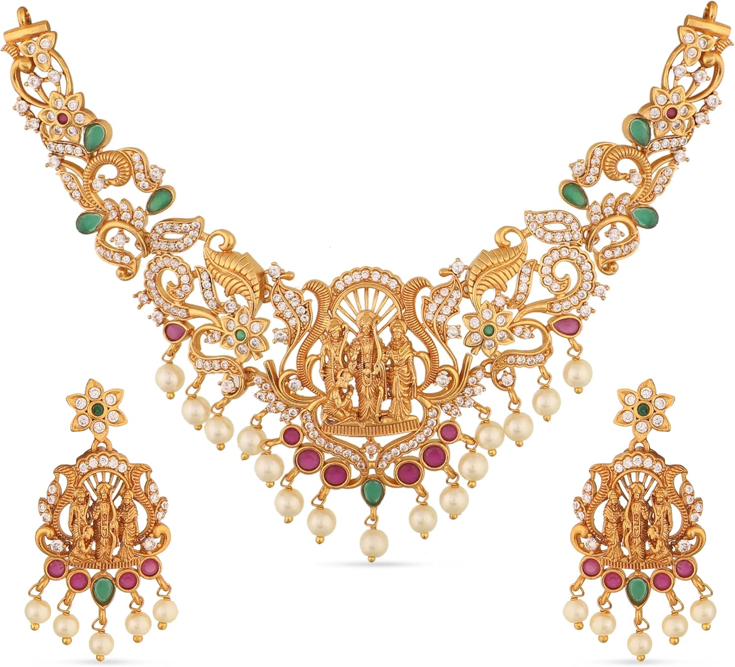 TARINIKA Antique Gold Plated Samaira Short Necklace Set with Floral Design - Indian Jewelry Sets for Women | Perfect for Ethnic Occasions | Traditional south Indian necklace | 1 Year Warranty*
