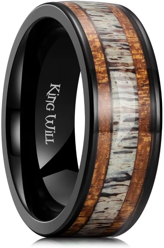 King Will 8mm Black Titanium Ring Sapele Wood Antlers Inlay Wedding Ring High Polished for Women Men Comfort Fit