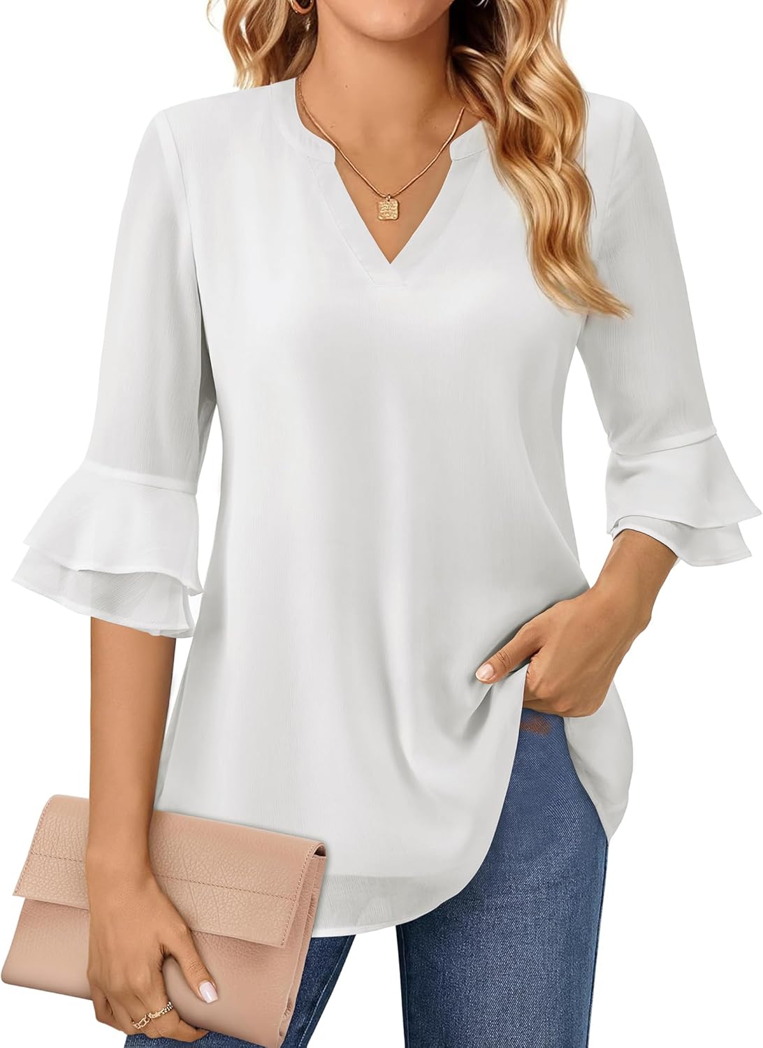 Flutter 3/4 Length Sleeve Womens Tops Dressy Casual Chiffon Blouse Double Layer Business Work Tunic Shirts