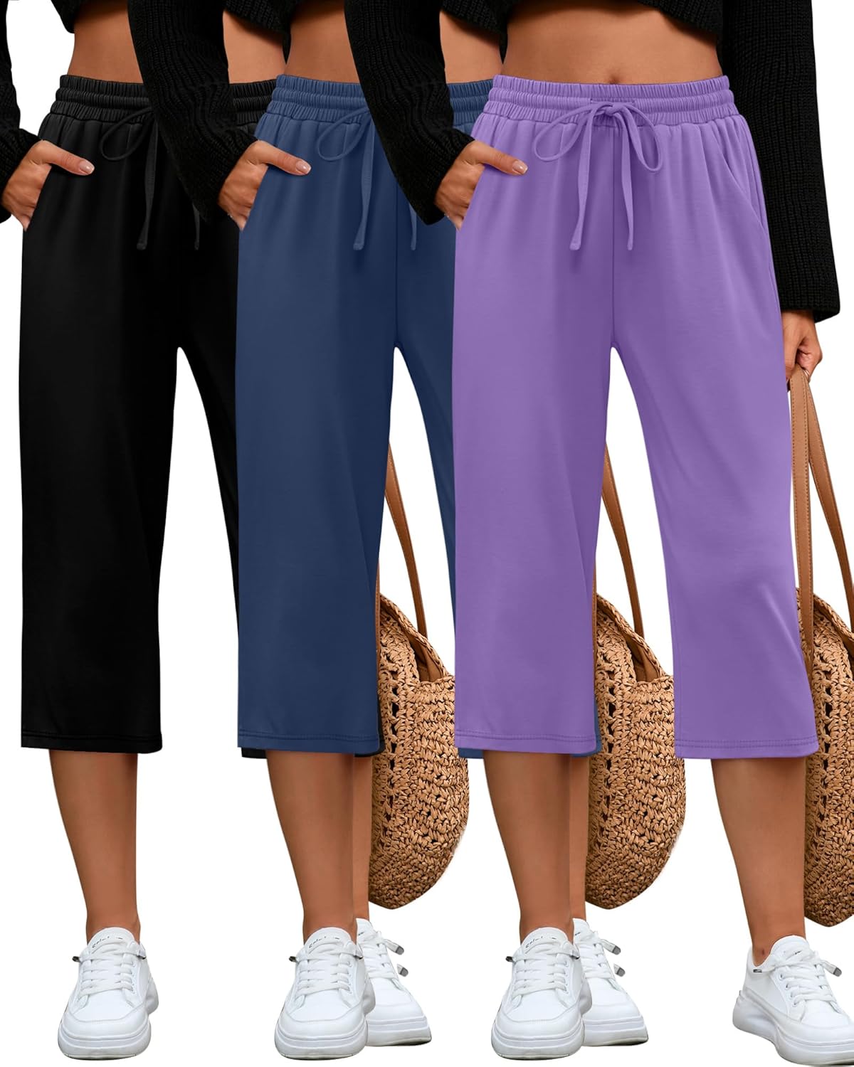 Huukeay 3 Pack Women's Capri Pants, Drawstring Lounge Capris Wide Leg Cropped Pants with Pockets Workout Yoga Joggers
