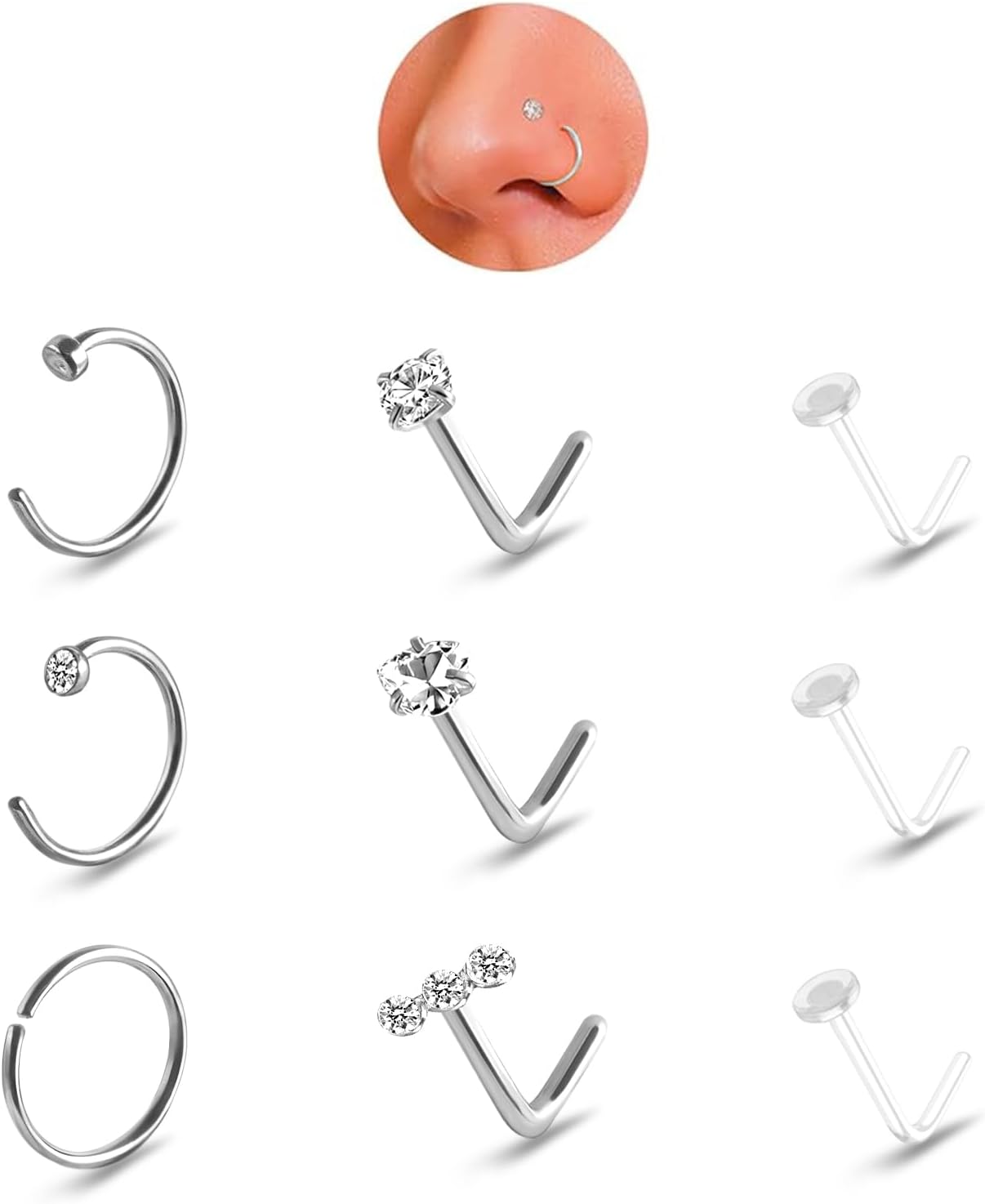 Nose Rings for Women 14K Gold Plated Hypoallergenic Surgical Steel Nose Ring Hoops 20g Nose Ring CZ Lip Ring L Shaped Studs Nose Piercings Jewelry for Women Men
