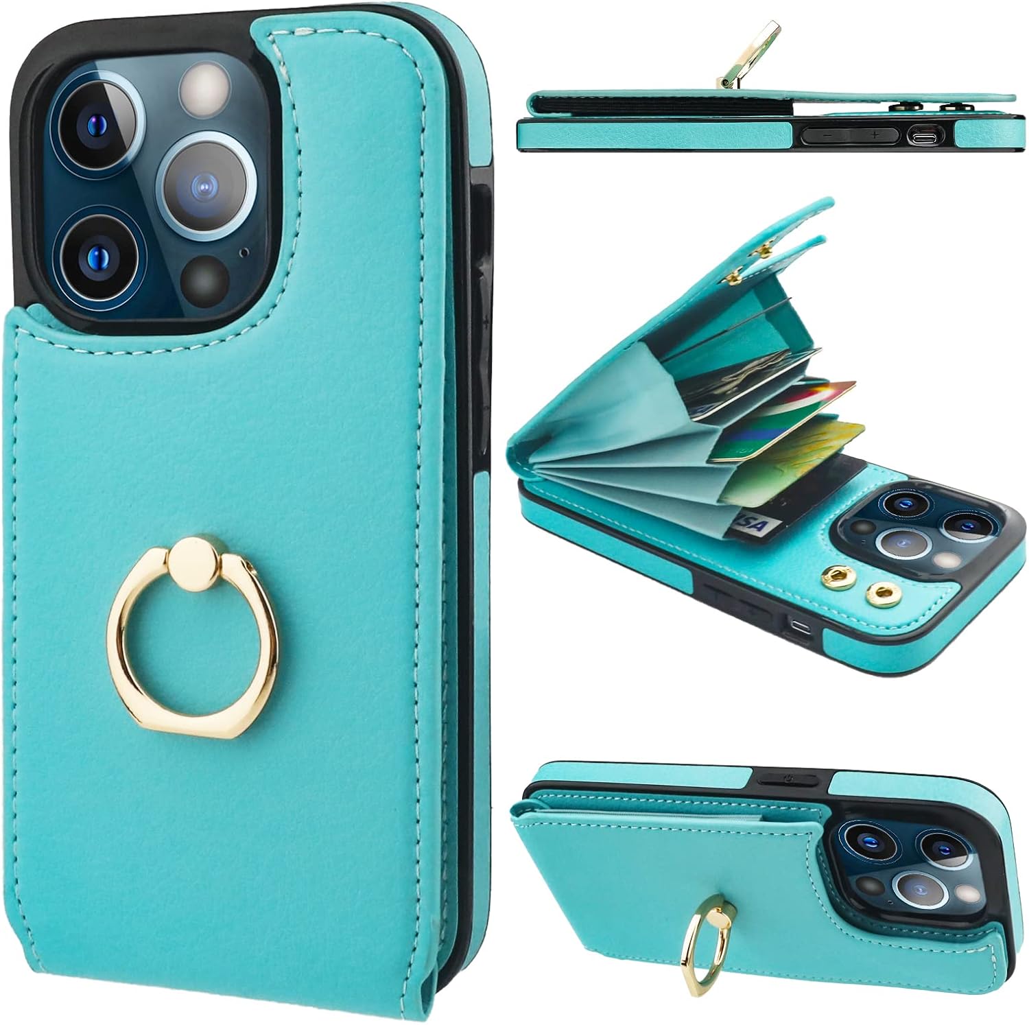 Folosu Compatible with iPhone 13 Pro Case Wallet with Card Holder, 360°Rotation Finger Ring Holder Kickstand Protective RFID Blocking PU Leather Double Buttons Flip Shockproof Cover 6.1 Inch Green