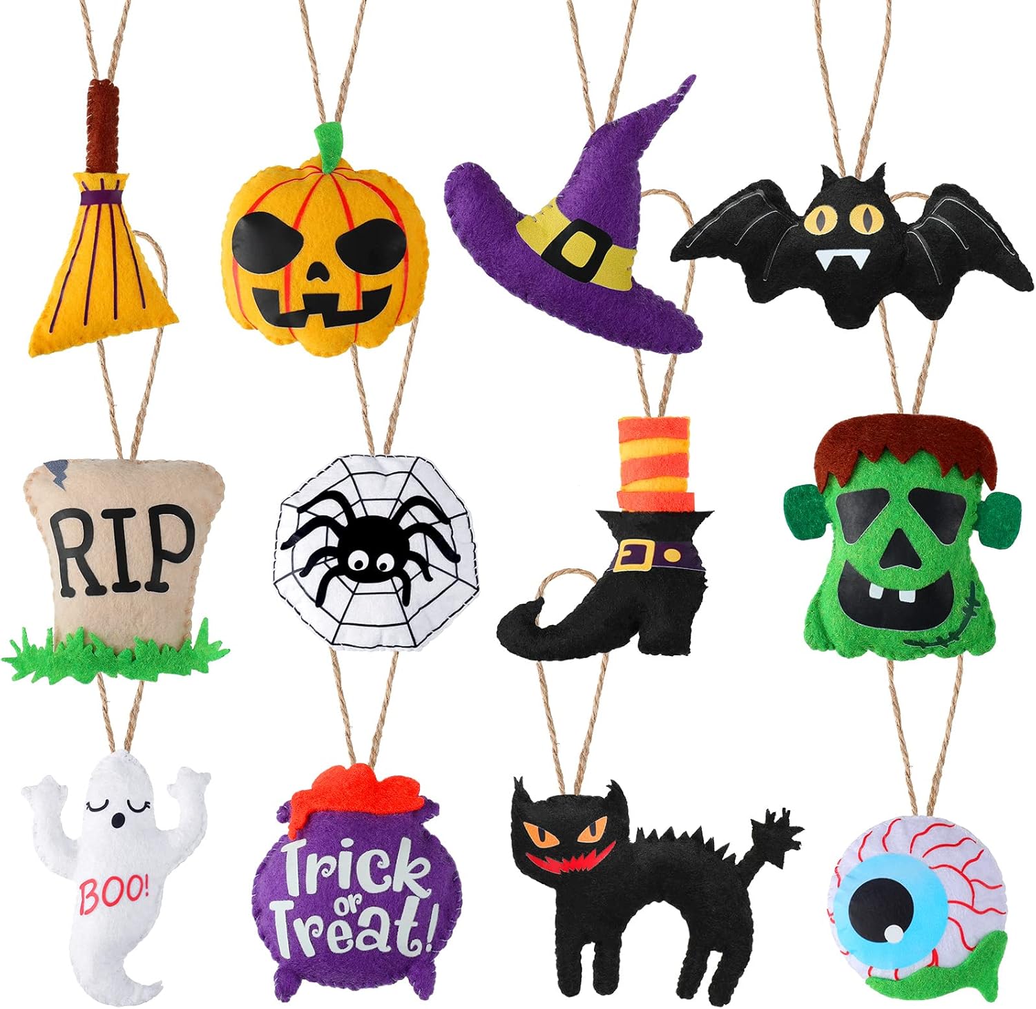 12 Halloween Tree Ornaments - 3D Felt Hanging Decorations: Pumpkin, Black Cat, Ghost, Witch Hat, Spider, Bat for Party Decor