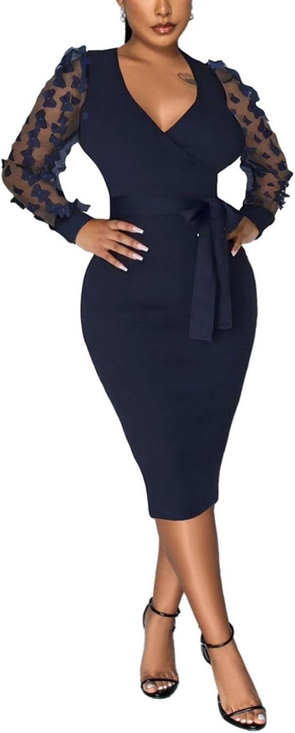 Ophestin Women's Long Puff Sleeve Bodycon Dress Mesh Bishop Sleeve Sexy V Neck Party Church Work Midi Dresses