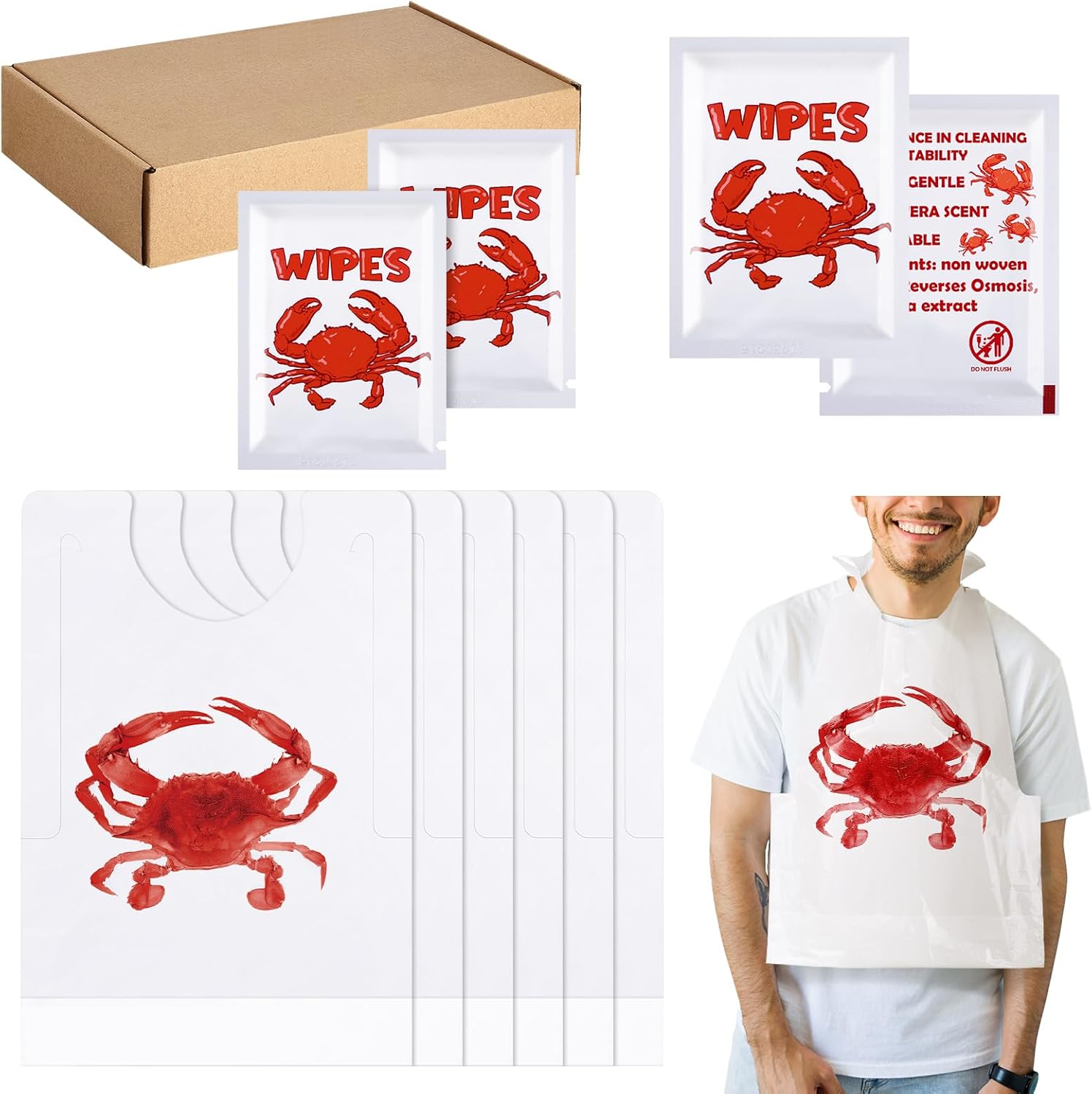 Wesiti 100 Pcs Lobster Crab Bib Wet Wipe Set 50 Crawfish Bib Disposable Adult 50 Moist Towelettes Seafood Boil Party Supply