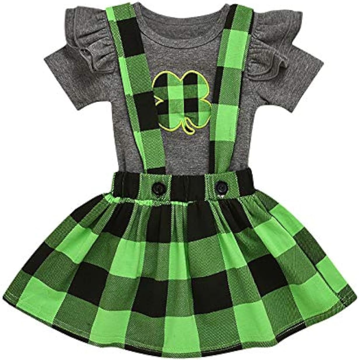 Baby Girls St.Patrick's Day Outfits Shamrock Clover Print Ruffle Short Sleeve Romper +Green Plaid Suspender Skirt Set