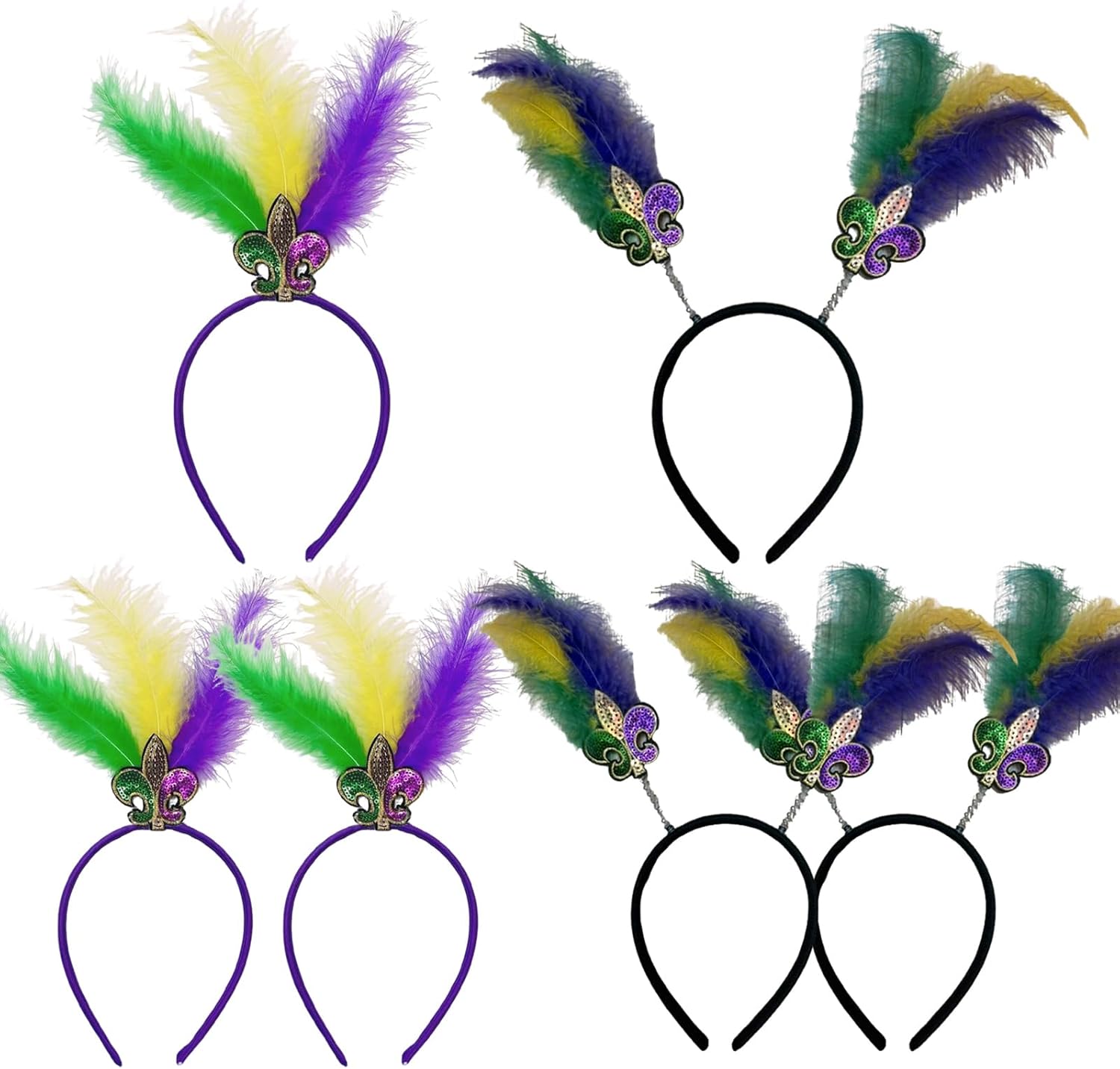 Mardi Gras Headbands with Feathers, 6-Pack, Fleur De Lis Design, Purple Yellow Green