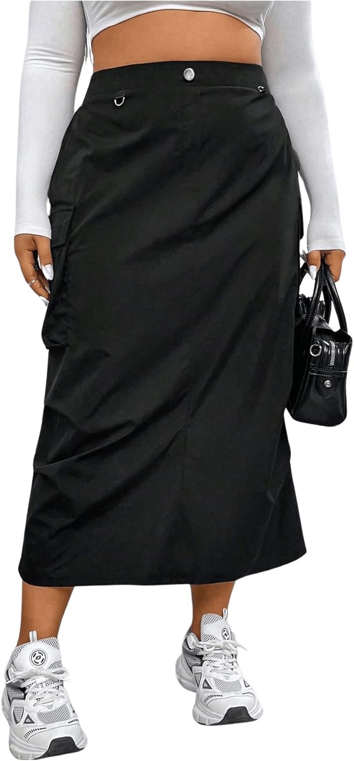 OYOANGLE Women's Plus Size Elastic High Waist Cargo Skirt Casual Solid Midi Skirts