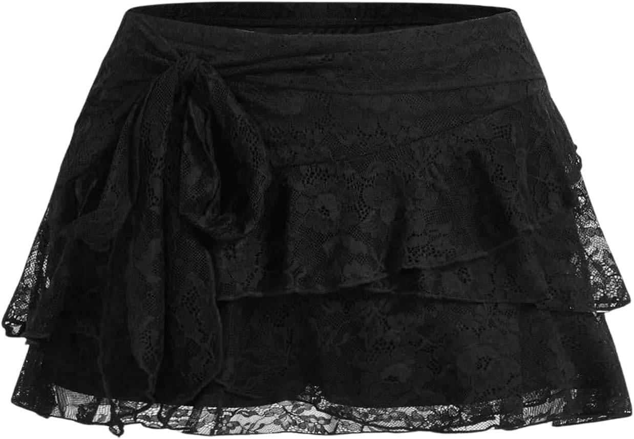 SHENHE Women's Lace Low Rise Y2k Layered Ruffle Tie Bow Mini Skirt Cute Cake Skirt