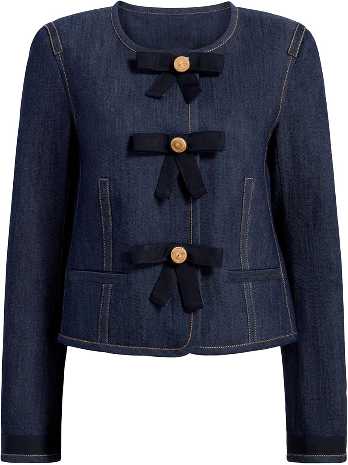 Women's Long Sleeve Cropped Collarless Jean Jacket Button Down Casul Slim Fit Y2k Bow Short Denim Jackets