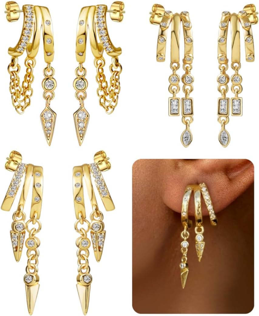 3 Pairs Gold Silver Earrings for Women,14k Gold Plated Huggie Small Hoops Earrings Cute Statement Chain Earring Dainty Drop Earrings for Women Trendy Jewelry