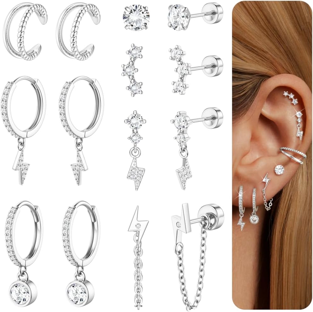 Dochais Flat Back Cartilage Earrings for Women Trendy Dainty CZ Flatback Studs Earing Sets 14k Gold Plated Hypoallergenic Huggie Hoops Earring Stacks for Multiple Piercing