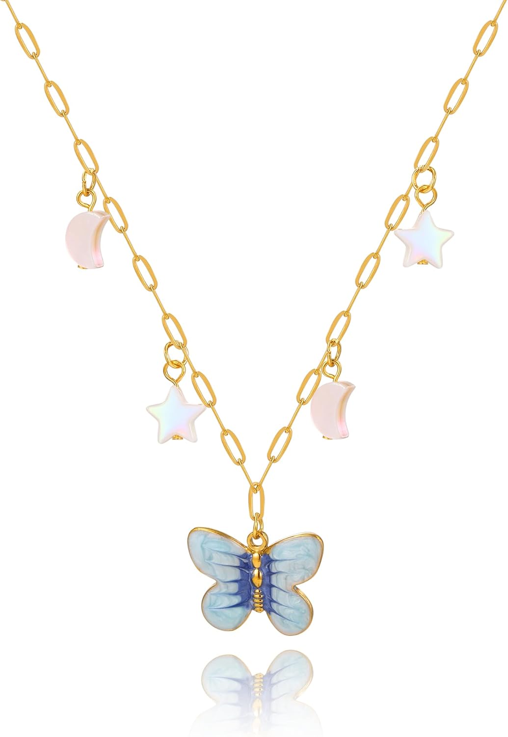 Boho Blue Butterfly Pendant Charms Necklace for Women,Holiday Stainless Steel Chain Jewelry Star Moon Charms Choker Necklace Adjustable
