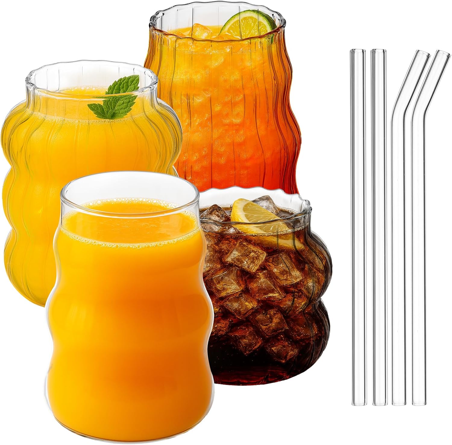 MAQUITA 4 Pcs Ribbed Glass Cups with Glass Straw, Vintage Drinking Glassware with Wave Shape Design, Bubble Cups for Iced Coffee, Juice, Beverage, Milk, Cocktails, Bubble Tea, and More