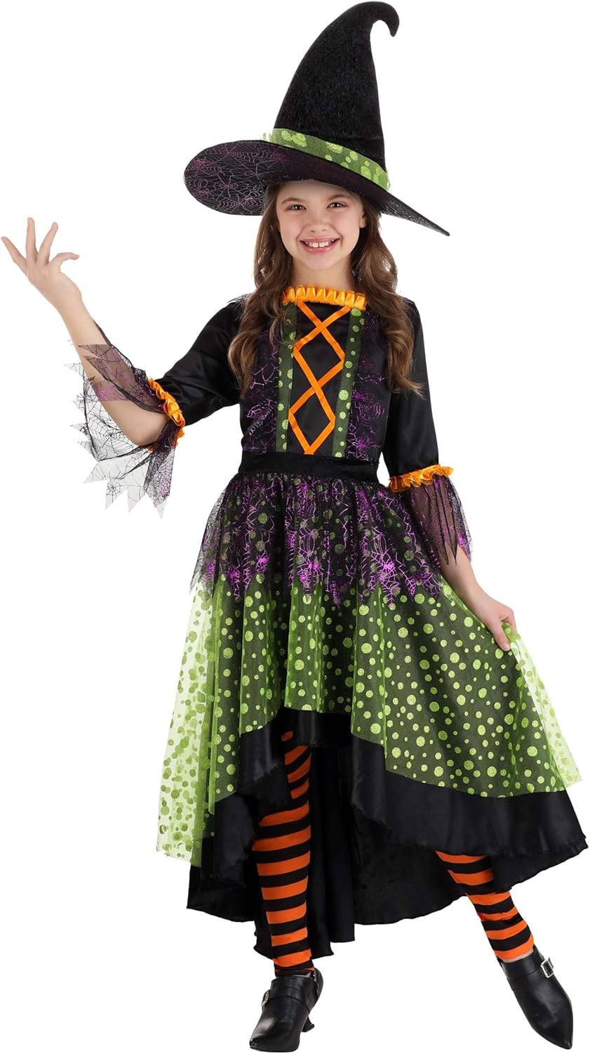 Witch Costume For Girls | Colorful Black, Orange, Purple, and Green Halloween Dress, Includes Leggings and Hat
