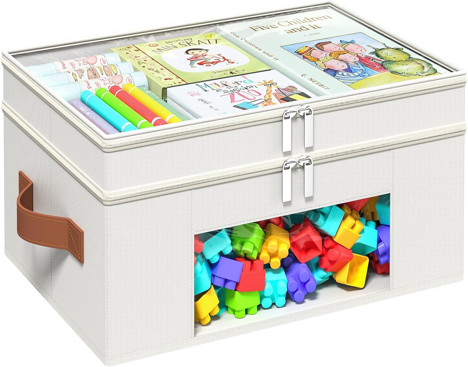 18 QT Craft Organizers and Storage Box with Transparent Cover and Leather Handles, 2-Layer Art Supply Organizer for Crayon, Coloring Books, Modeling Clay, Molds and Sewing, Beige