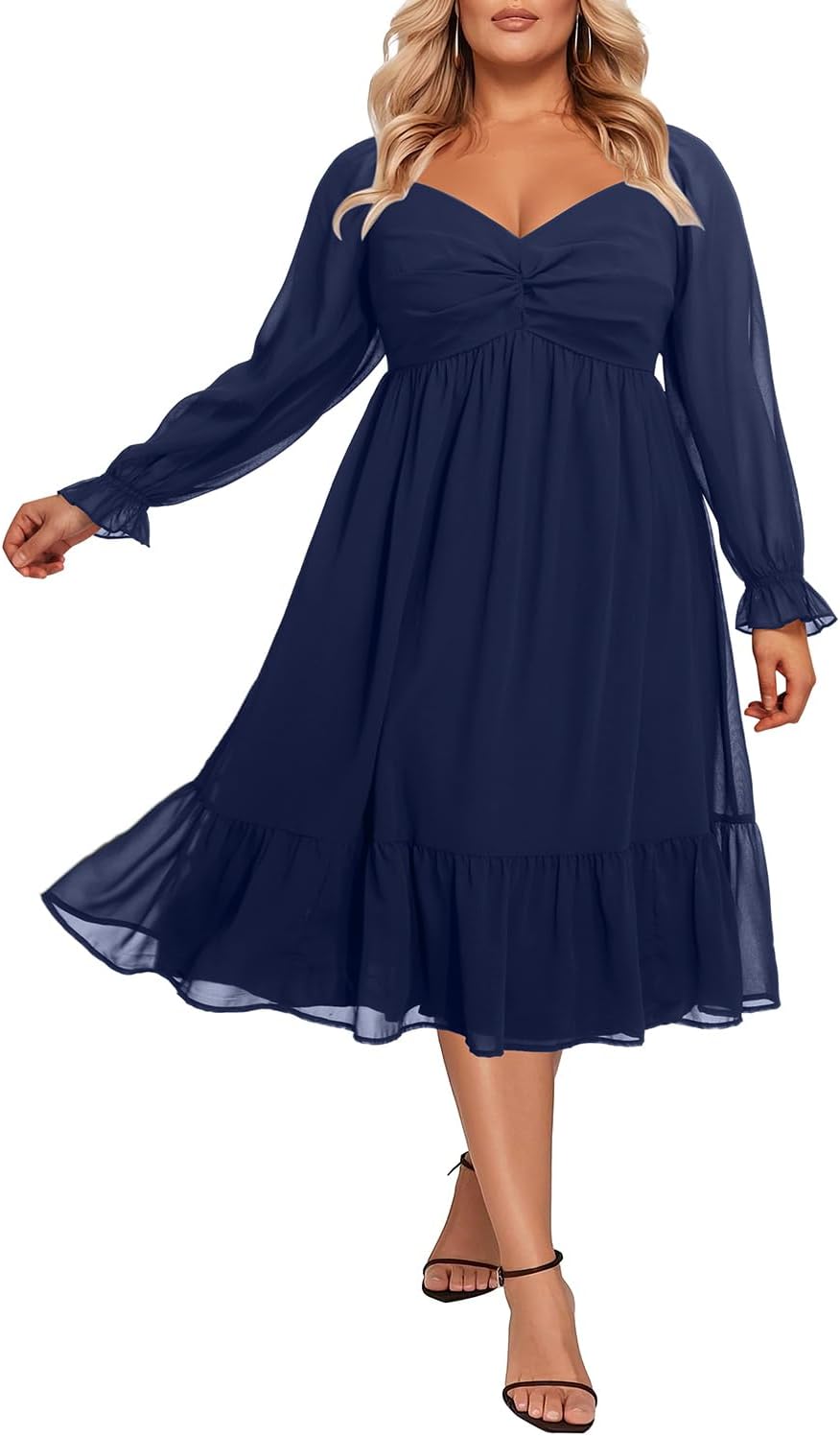 Plus Size Dresses Sweetheart Neckline Long Sleeves Chiffon Party Cocktail A Line Curvy Womens Midi Dress
