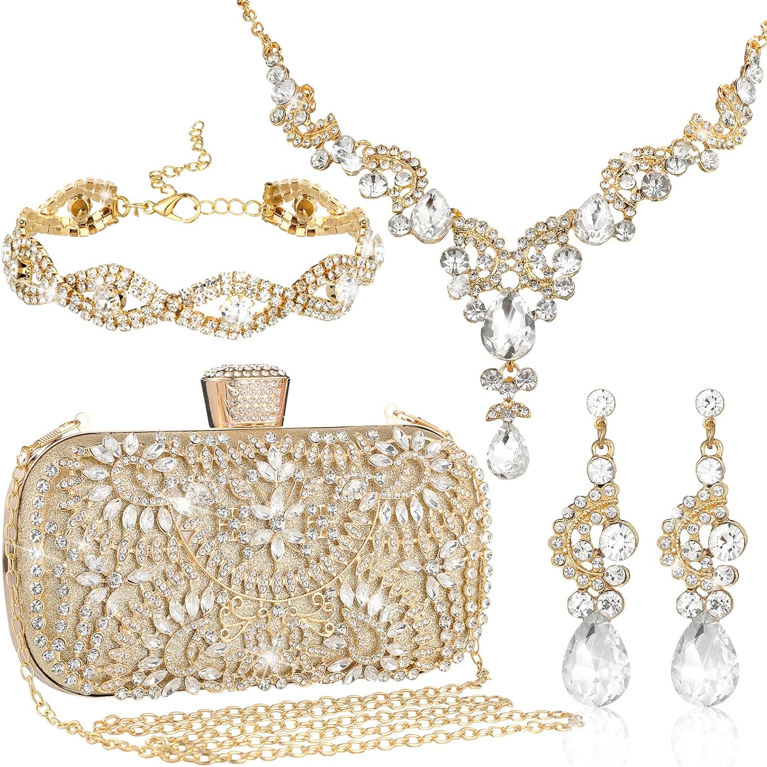 Quelay 4 Pcs Purse Rhinestone Jewelry Set for Wedding Bridal Women Handbag with Necklace Bracelet Dangle Earrings