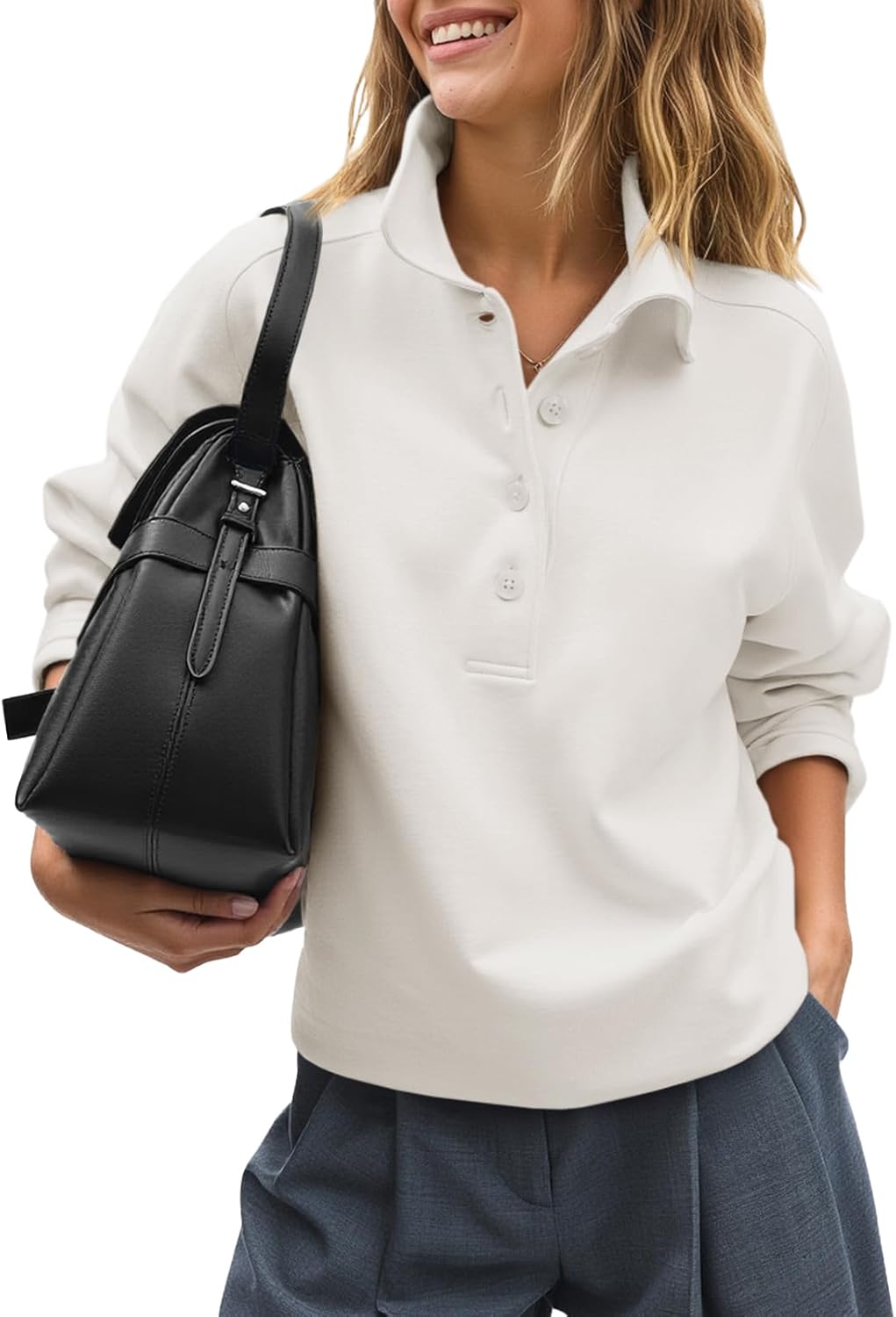 Fisoew Womens Casual Sweatshirt Long Sleeve Button Collared Loose Fit Fall Pullover Tops