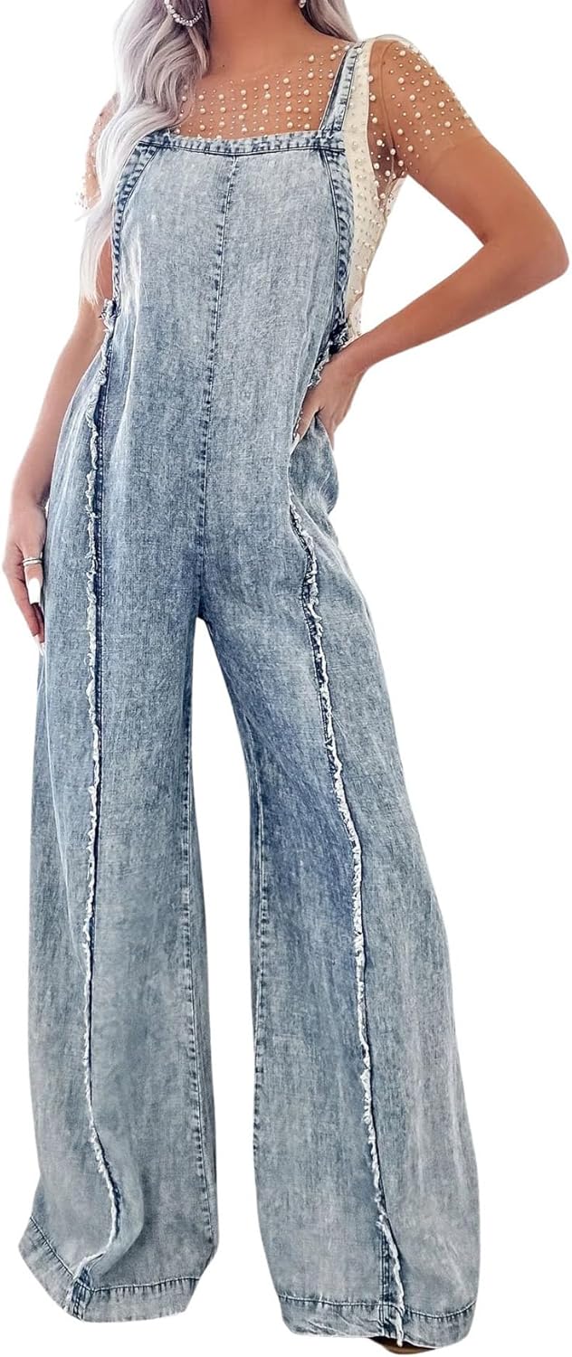 CHARTOU Women Loose Fit Denim Jumpsuit Adjustable Straps Wide Leg Long Pants Frayed Jean Overalls