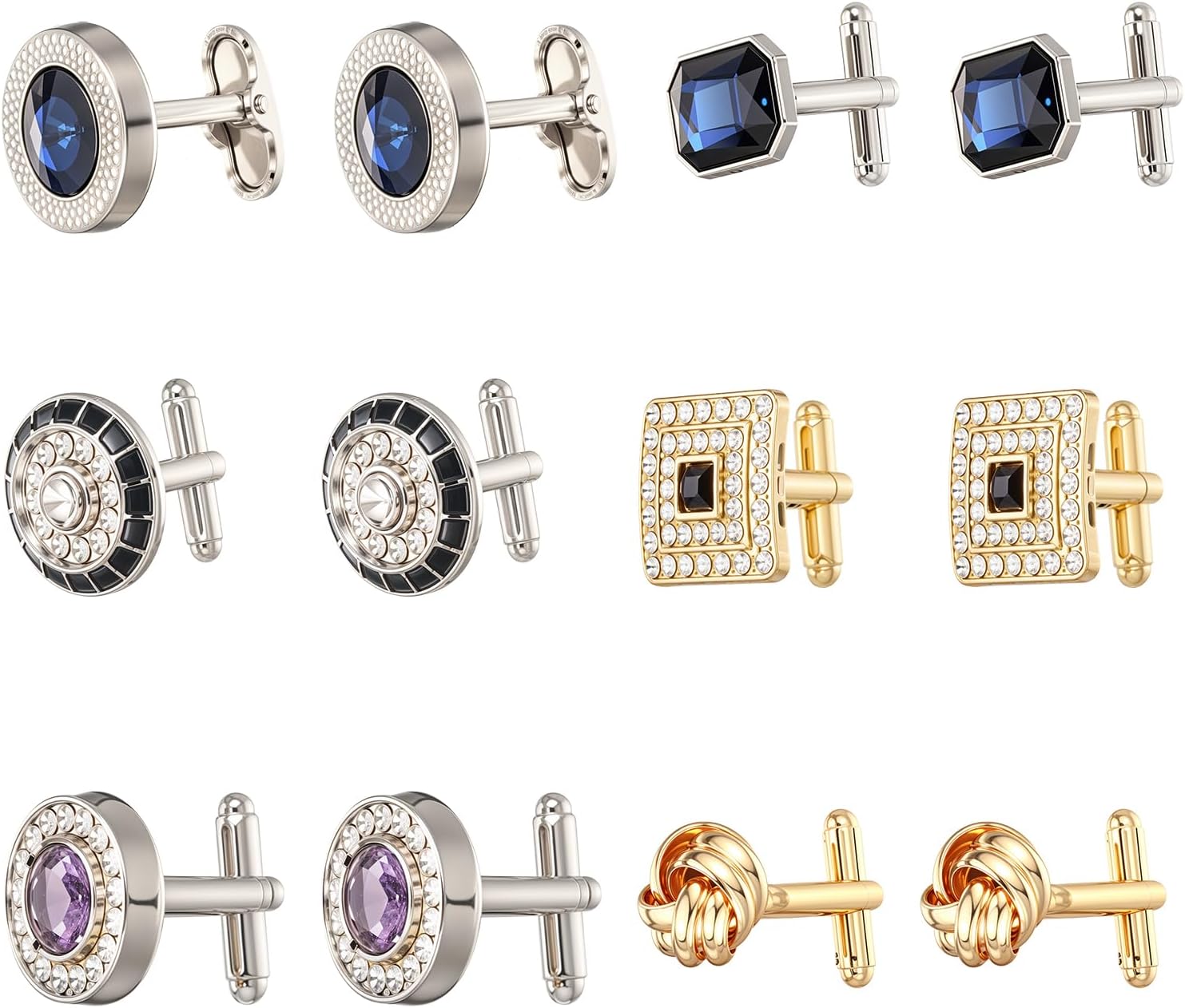 6 Pairs Cufflinks for Men Gorgeous Diamond Crystal Cufflinks Fashion Classic Tone Cuff Links Round Square Rectangle Cuff Links Shirt Studs Formal Business Wedding Gifts for Men