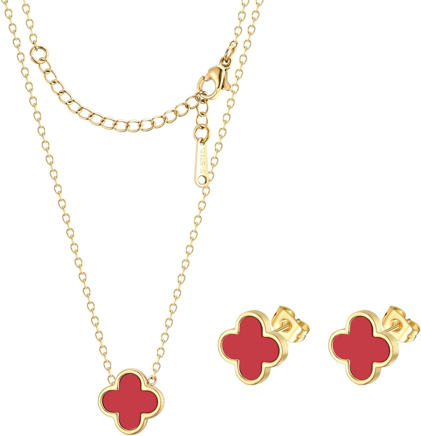 Clover Necklace and Stud Earrings Jewelry Set White Black Red Clover Pendant Necklace 18k Gold Plated Four Leaf Clover Necklace Earrings Set Gifts for Women