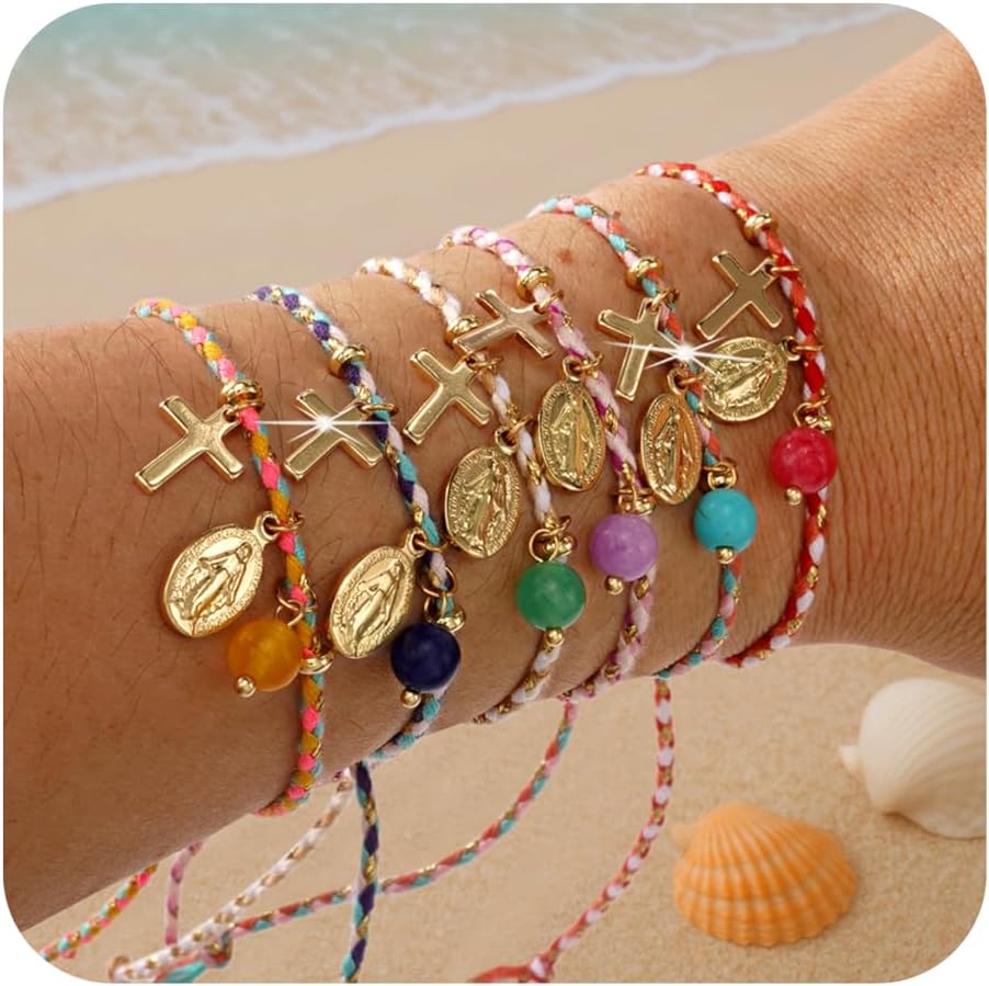 Cross Bracelet for Women Handmade Crystal Stackable Adjustable Colorful Braided String Rope Bracelet Stack Natural Stone Beads Religious Jewelry Christian Friendship Gifts for Women