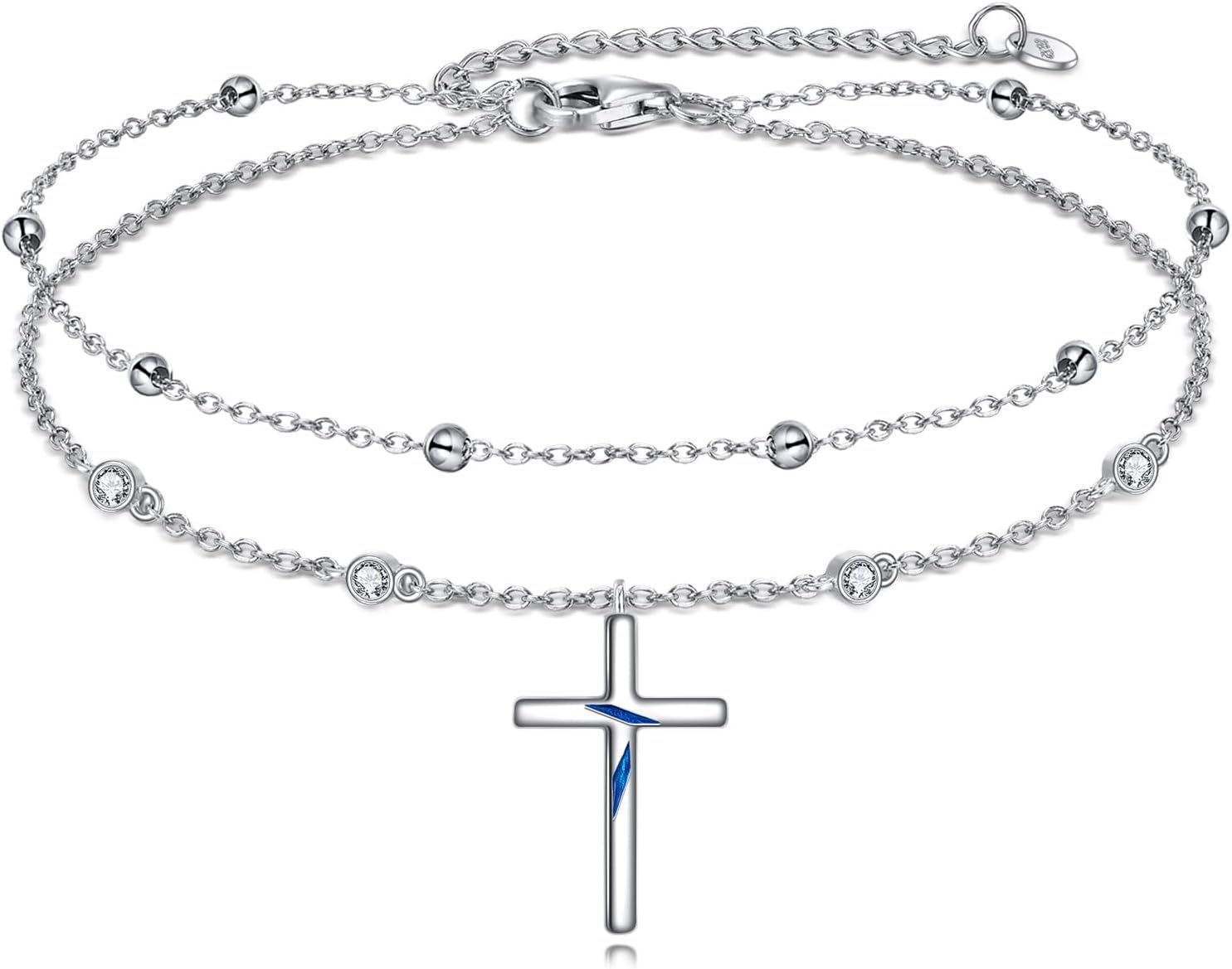 LUHE Cross Ankle Bracelets Sterling Silver Religius Double Chain Anklets Christian Baptism Layered Anklet Jewelry Gifts for Women