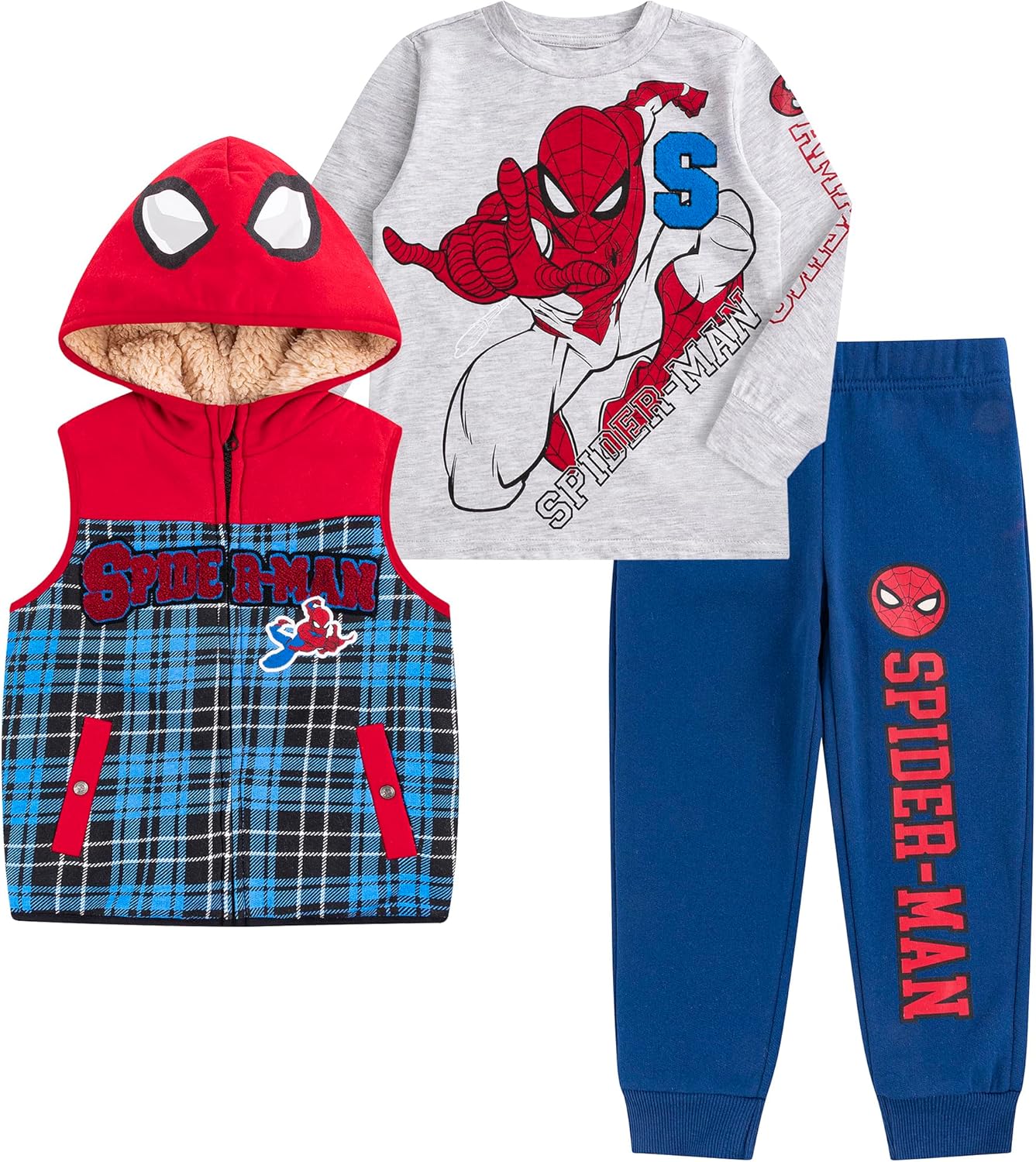 Marvel Spider-Man Boys Sherpa Lined Hooded Vest, Fleece Pants, and Crewneck Top 3 Piece Set for Infant to Toddlers