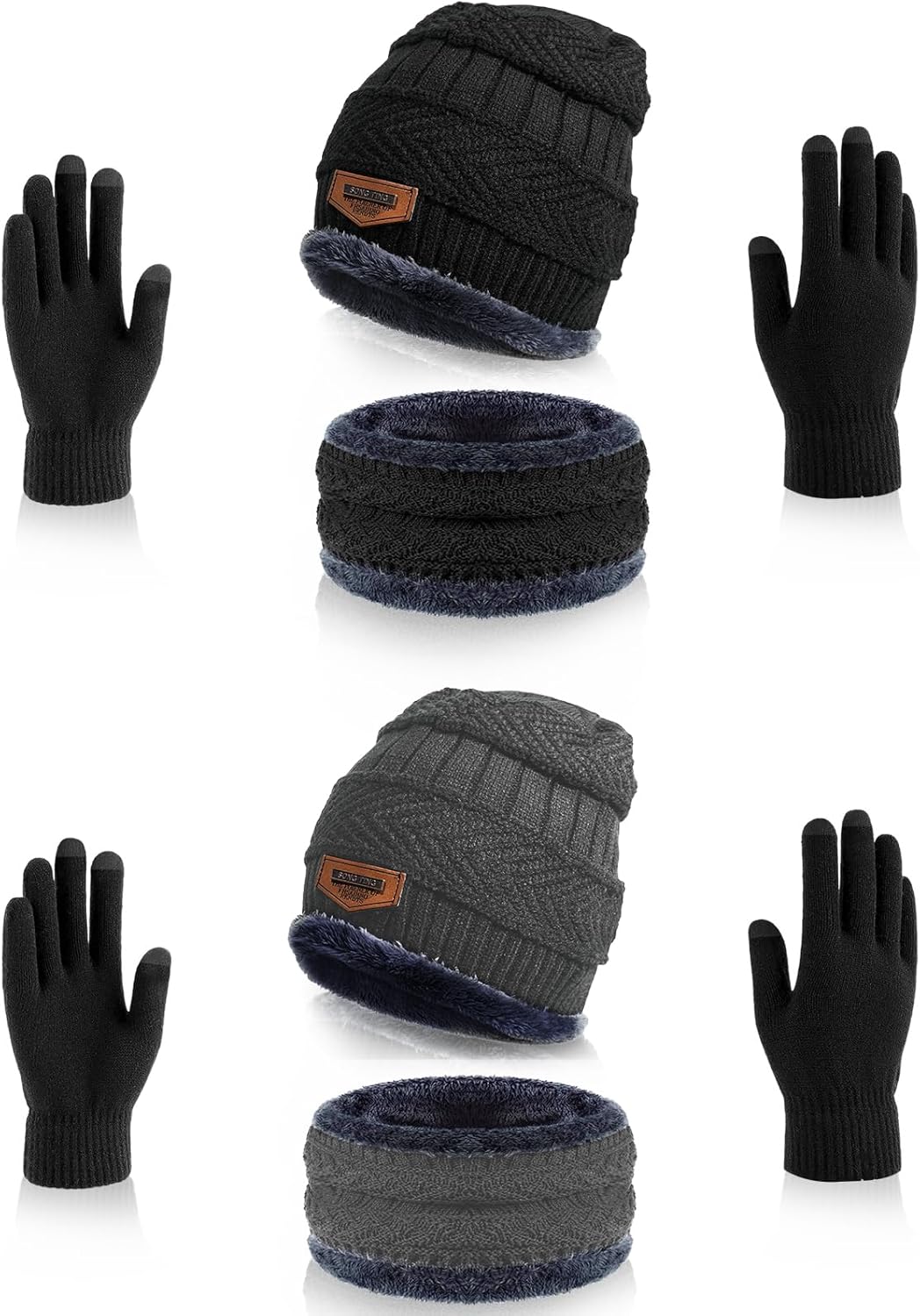 Winter Beanie Hat Scarf Gloves Set Thick Knitted Lined Skull Cap Neck Warmer Scarves Touchscreen Gloves for Men Women (Black+Gray)