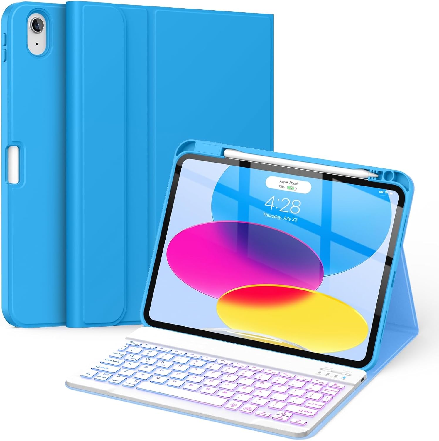 Soke for iPad (A16) 11th/10th Generation Case with Keyboard(2025/2022)-7 Color Backlight Wireless Detachable Folio Keyboard Cover with Built-in Pencil Holder for iPad 11/10.9 inch, Sky Blue