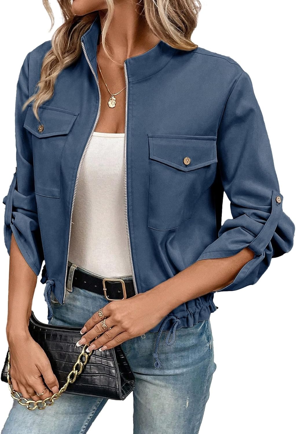 EVALESS Womens Zip Up Jacket Roll Tab Sleeve Flap Pocket Drawstring Hem Utility Lightweight Cropped Jackets