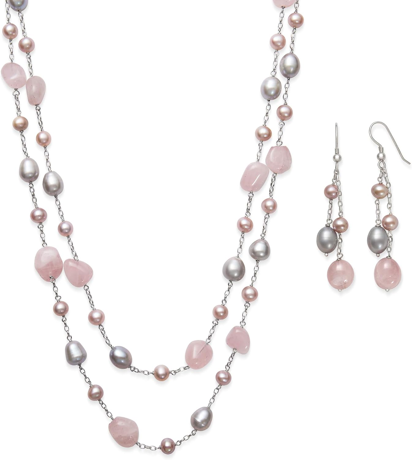 Belacqua Natural Aquamarine or Rose Quartz Cultured Freshwater Pearl Layered Station Necklace in Sterling Silver, Multi-Strand 18" Rolo Chain, Real Pearl Jewelry for Women, Gift Box Included