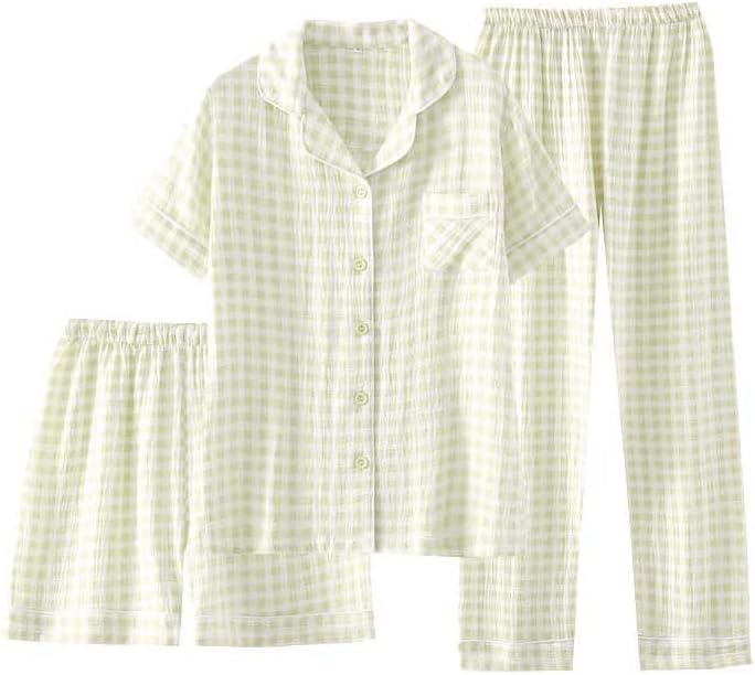 Womens Cotton Pajama Sets Plaid Short Sleeve Button Down Sleepwear Ankle Pants 3 Piece Gingham Pj Set