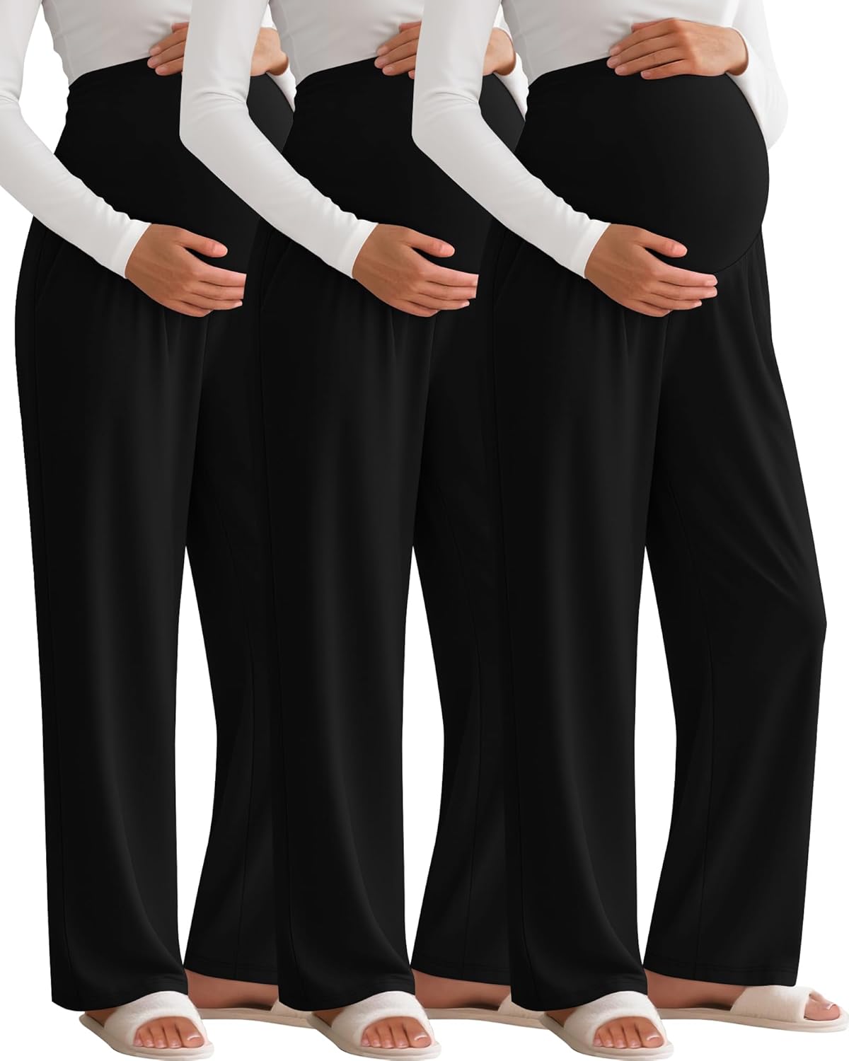 3 Pack Women's Maternity Pants Over The Belly Pregnancy Pants Stretchy Loose Wide Leg Lounge Pajama with Pockets(Black, Black, Black,Large)