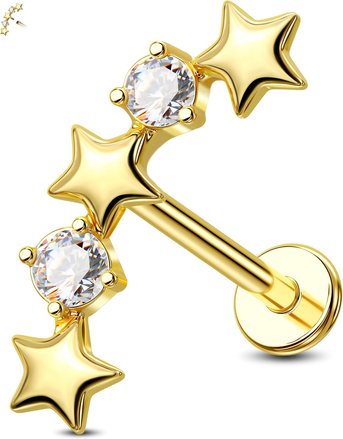 Jewseen 16g Internally Threaded Flat Back Earrings 316L Stainless Steel Star Helix Earrings Heart Cartilage Stud Earrings Gold Lip Piercing Jewelry Nose Stud for Women