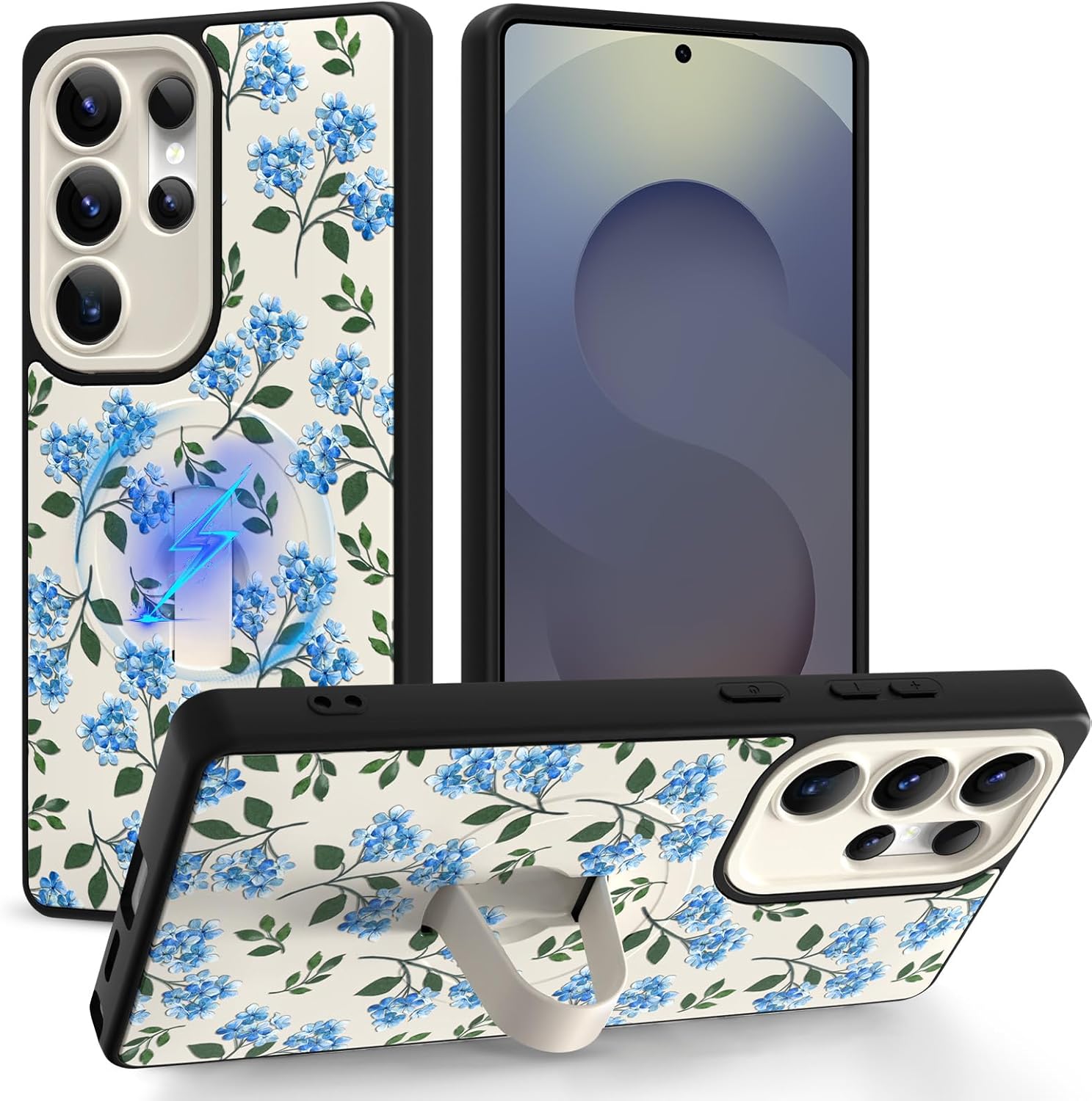 Magnetic for Sumsung Galaxy S25 Ultra Case with Finger Strap Stand, Compatible with Magsafe, Cute Floral Flower Phone Case for Women Men Slim Shockproof Cover for S25 Ultra, Blue Bouquet