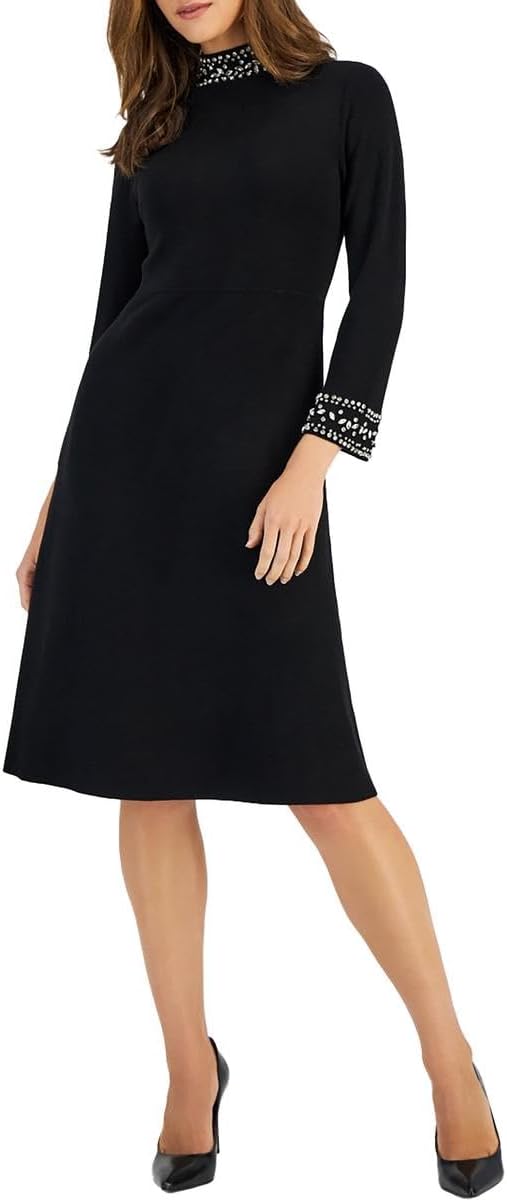 Anne Klein Womens Long Sleeve Embellish Mock Neck Dress