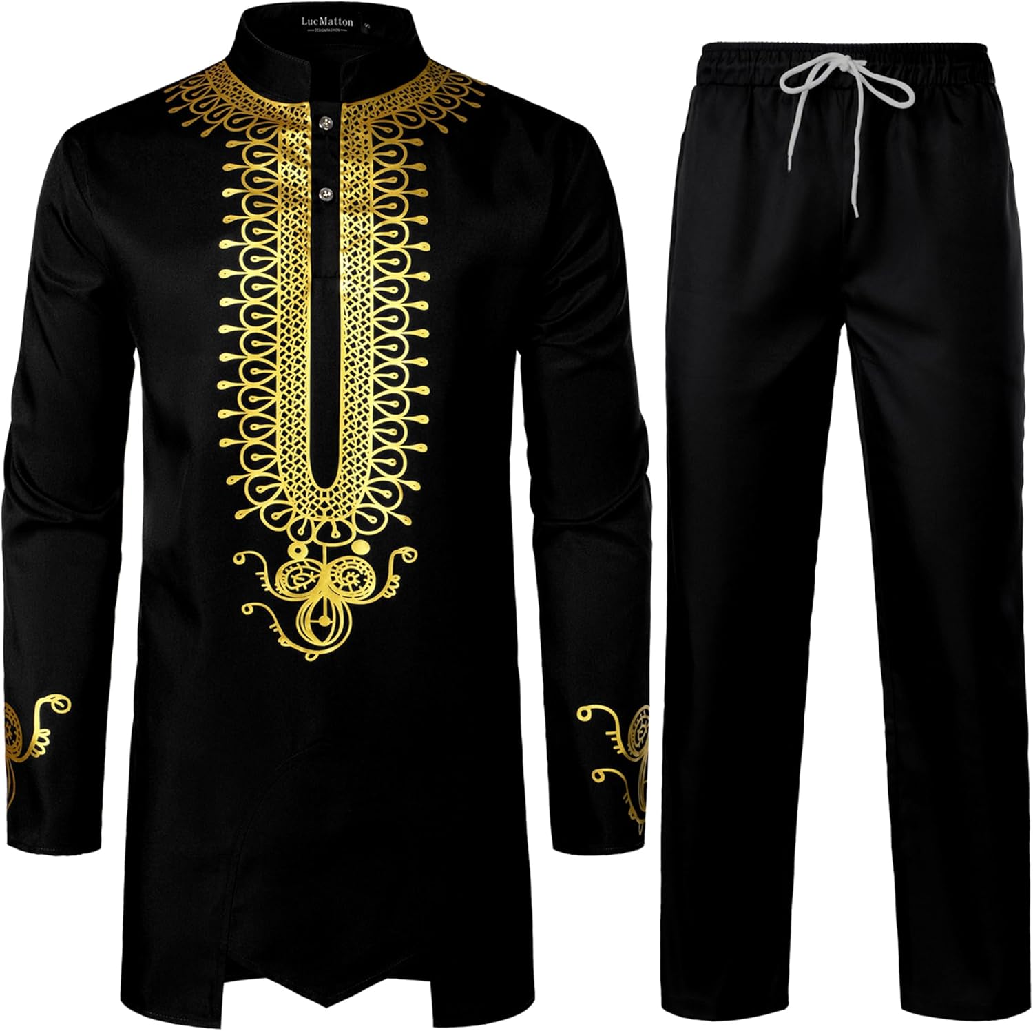 LucMatton Men's African Attire Outfit Gold Foil Print Long Sleeve Shirt and Pant Dashiki Suit 2 Piece Set