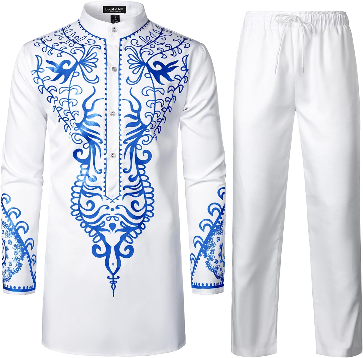 LucMatton Men's African Attire 2 Piece Set Gold Foil Print Mandarin Collar Long Sleeve Shirt and Pants Suit Dashiki Outfit