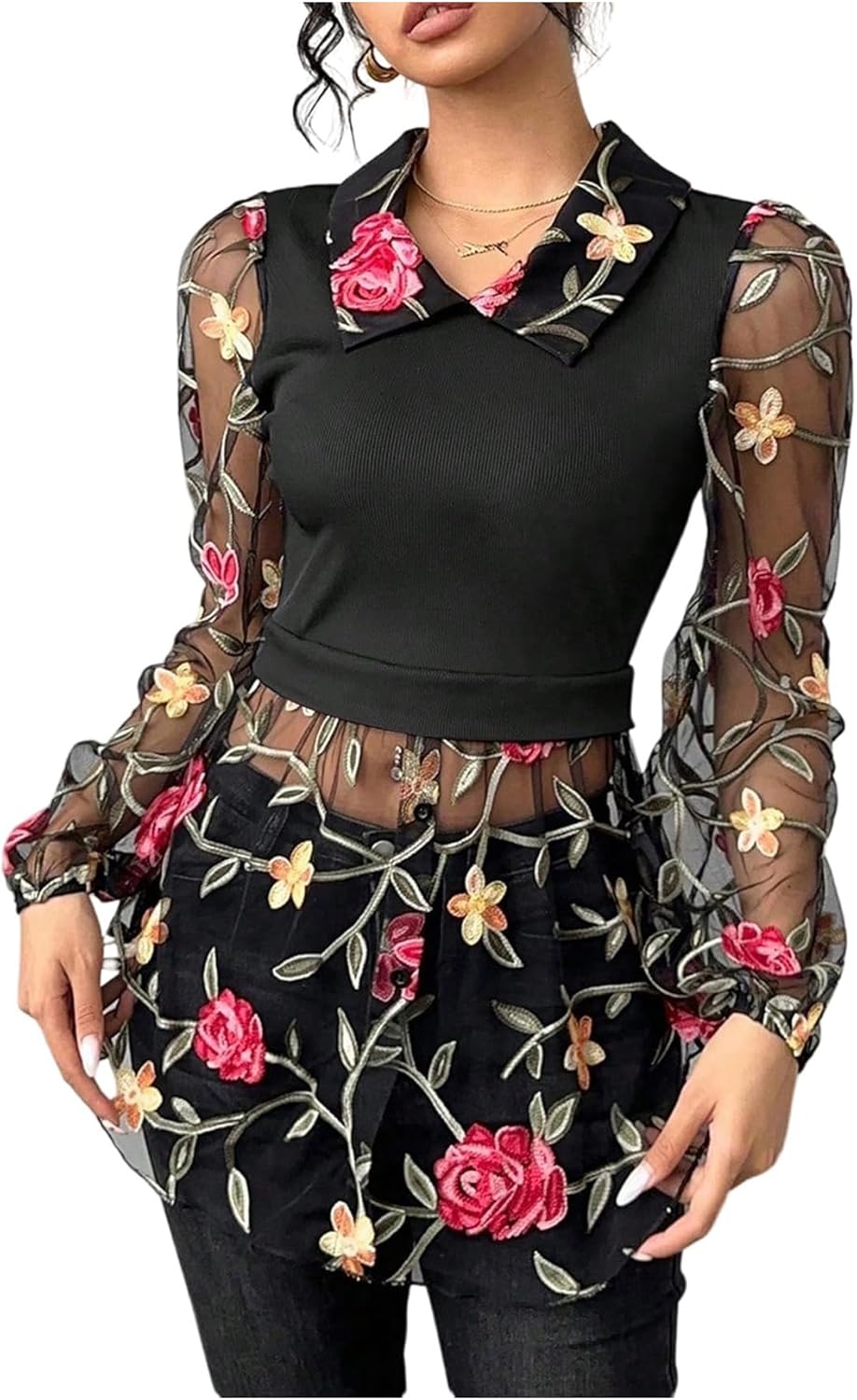 WDIRARA Women's Floral Embroidery Mesh Sheer Blouse Collared Bishop Long Sleeve 2 in1 Top