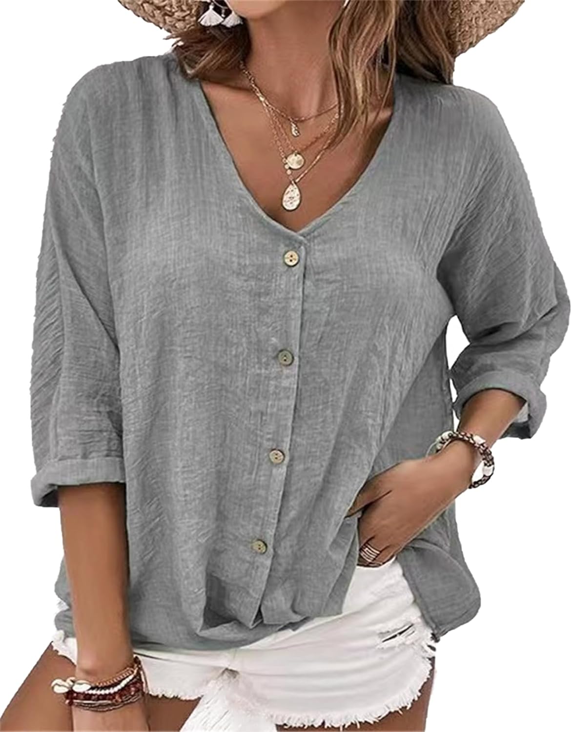 Linen Shirts for Womens V Neck Roll up Sleeve Shirt 2025 Spring Casual Loose Work Button Down Blouses Tops