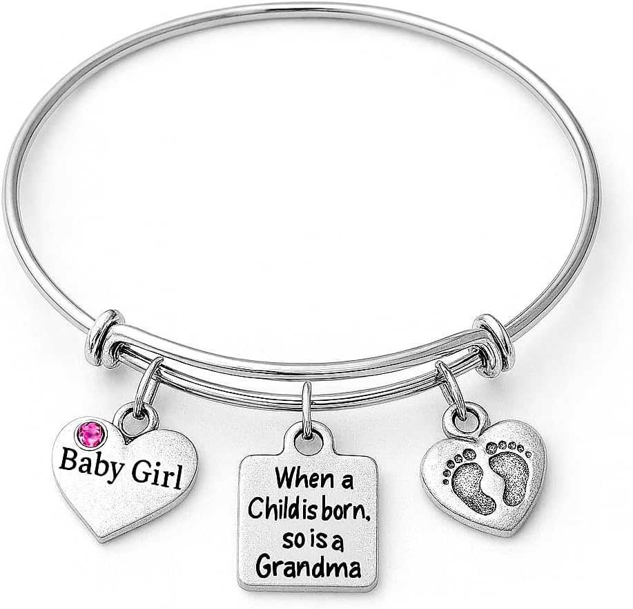 Baby Girl Grandma Bracelet – Expandable Silver Bangle with Baby Girl Charm, Pink Crystal Heart, Footprints Charm, New Grandma Gift, Baby Shower or Birth Announcement Jewelry