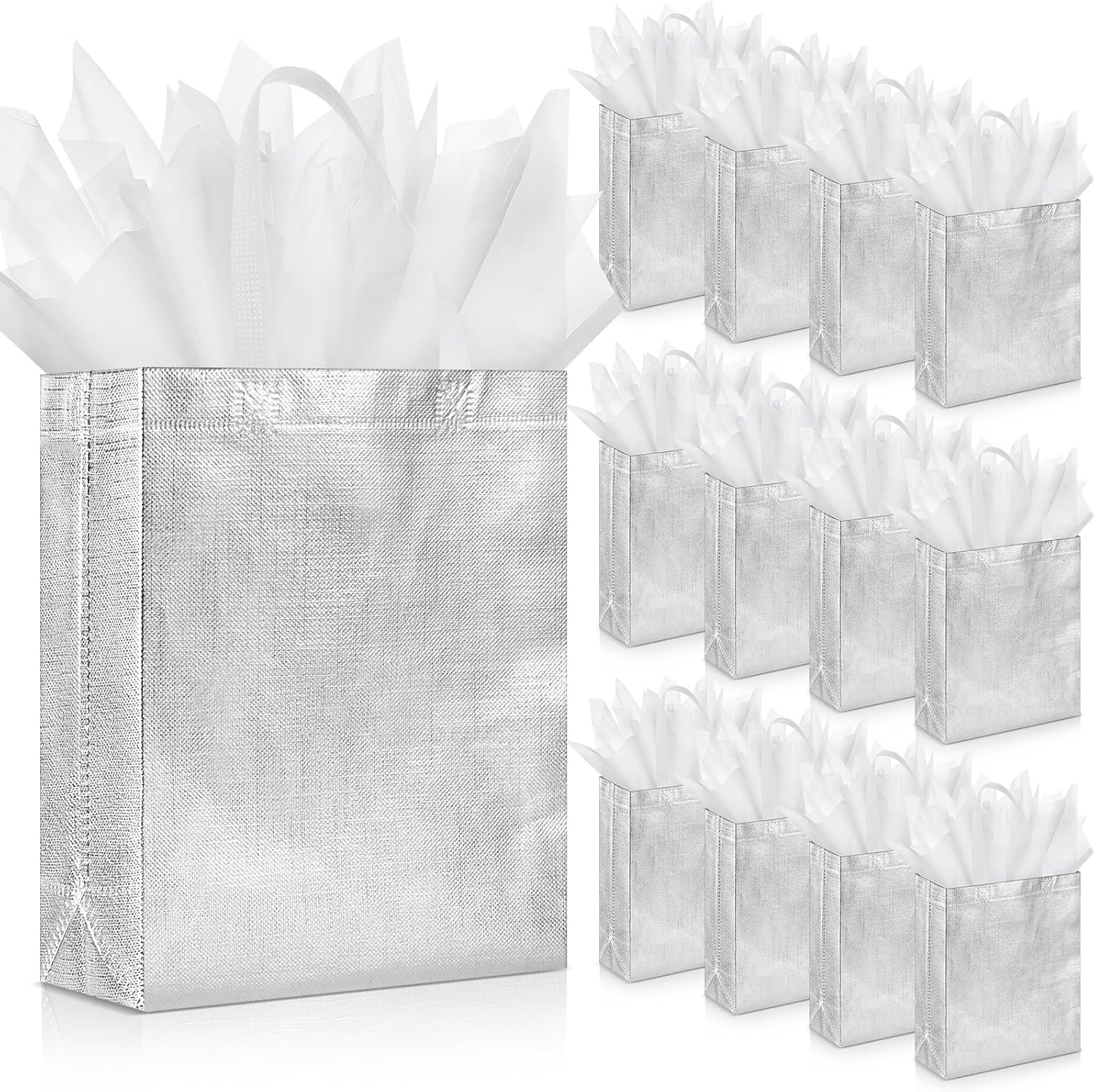 Sweetude 50 Pcs Reusable Gift Bags with Handles Grocery Gift Bags with Tissue Paper Glitter Shopping Bags for Present Birthday Wedding Party(Silver, 8 x 4 x 10 Inch)