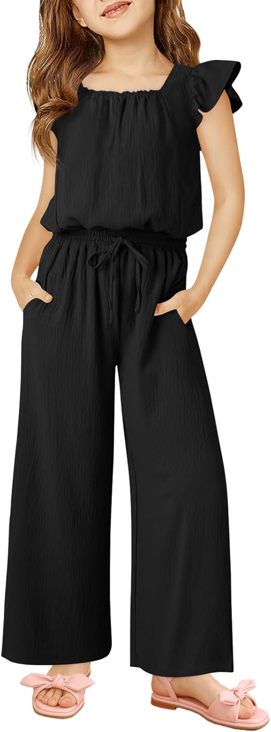 Haloumoning Girls Jumpsuits Kids Fashion Ruffle Sleeves Square Neck Rompers Drawstring Overalls with Pockets