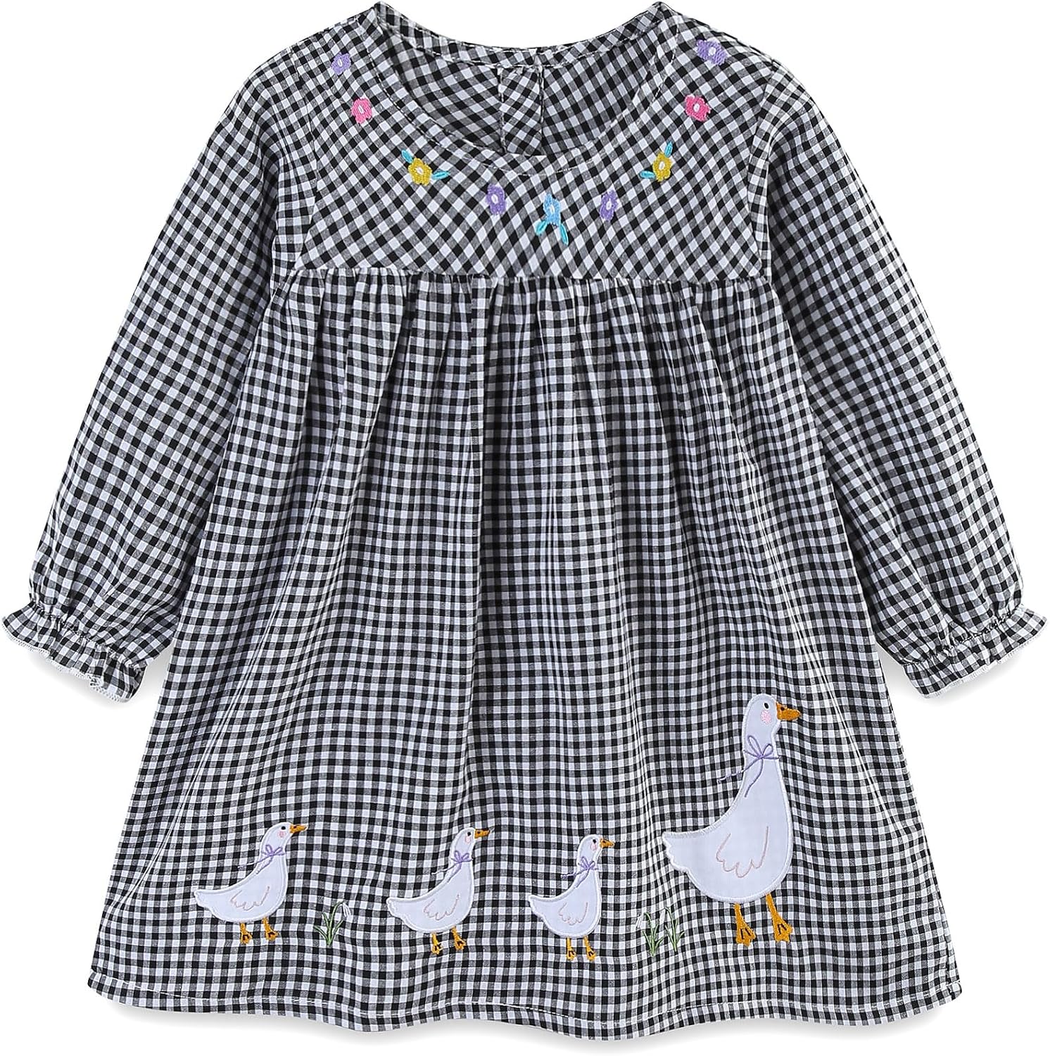 FreeLu Toddler Girls' Cotton Gingham Duck Embroidery Dress Long Sleeve Plaid Casual Dresses for 2-7 Years