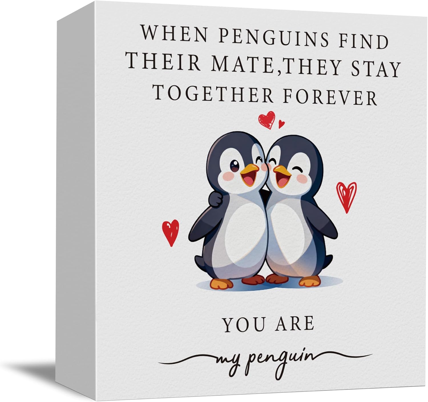 Penguin Love Wooden Box Sign - 5x5 Inch "When Penguins Find Their Mate, They Stay Together Forever" Cute Animal Sign, Valentine's Gifts for Couples, Anniversary, Wedding, Unique Romantic Decor