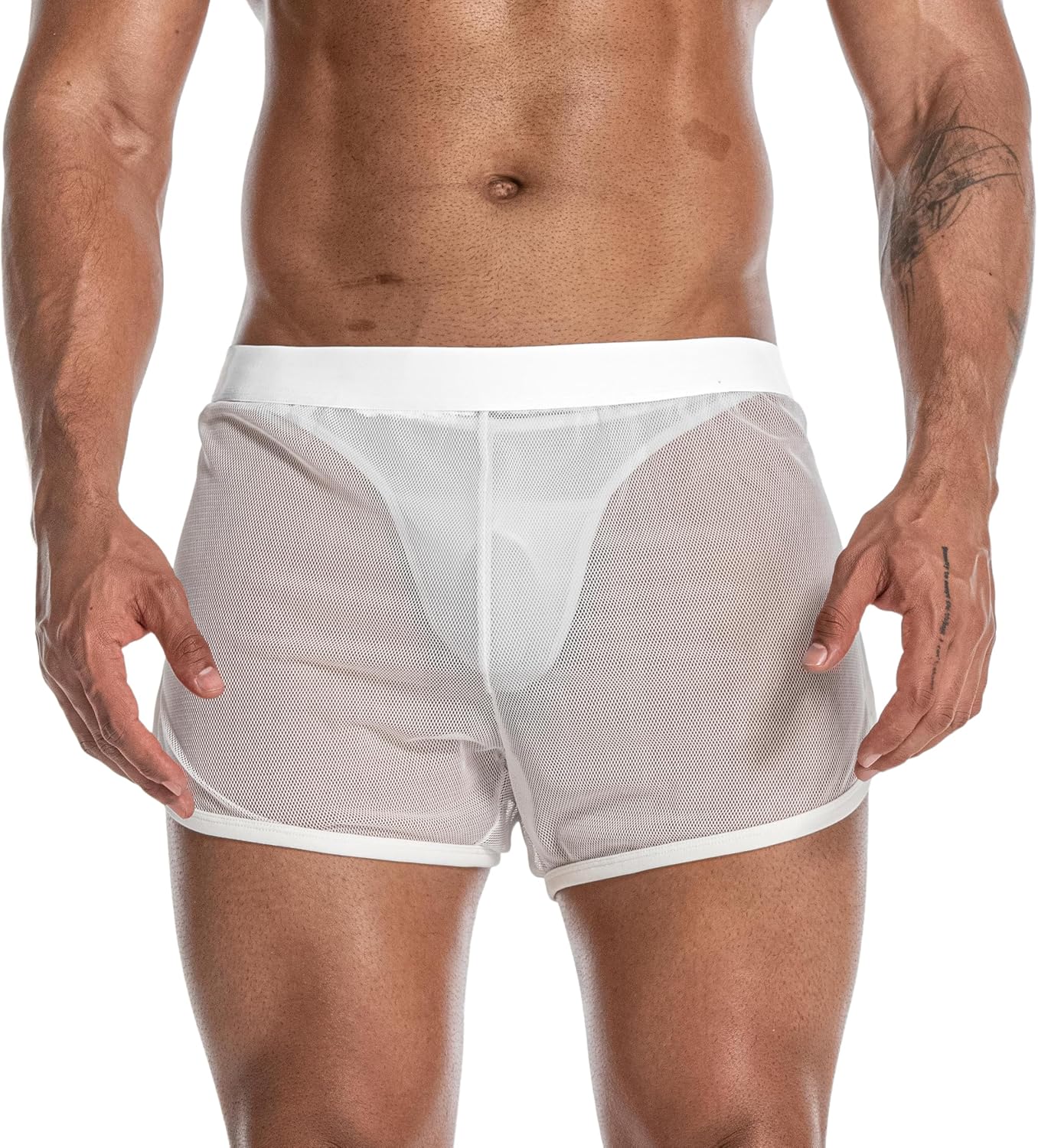 Mens Mesh Shorts Sexy Boxers See Through Boxers for Men(LightWhite Large)