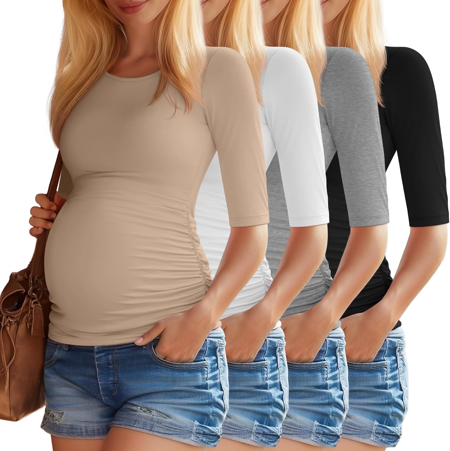 4 Pack Women's Maternity Shirts, Half Sleeve Side Ruched Tops Crew Neck Summer Casual Pregnancy Clothes